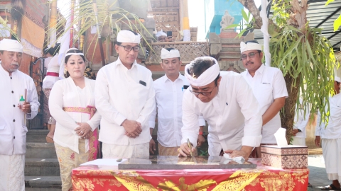 Tampak Walikota Jaya Negara dalam rangkaian upacara yang dipuput Ida Ratu Pedanda Gede Putra  Pemaron Mandara dari  Griya Kusuma Yati  Yangbatu berkesempatan “Ngiyas” atau menghias Betara Rambut Sedana, serta turut  menabuh dengan Sekaha Gong Yangbatu Kangin yang mengiringi pelaksanaan upacara dan penandatanganan prasasti.