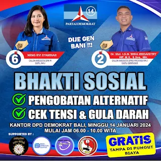 DENPASAR, Jarrakpos.com – DPD Partai Demokrat Provinsi Bali bersama Padepokan Mas akan menggelar Bakti Sosial (Baksos) pengobatan Kesehatan gratis untuk masyarakat umum. Kegiatan Bhakti Sosial akan di gelar pada Minggu, 14 Januari 2024, di Kantor DPC Partai Demokrat Kota Denpasar, Jalan Ir. Juanda no.4 Niti Mandala Renon, Denpasar, Bali, mulai pukul 07.00 Wita sampai dengan pukul 10.00 Wita.