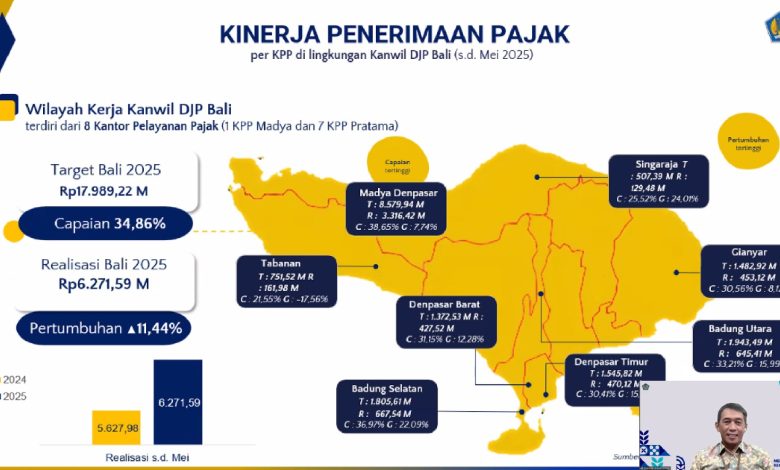 jarrakposbali.com, DENPASAR – Penerimaan pajak yang tercatat oleh Kantor Wilayah Direktorat Jenderal Pajak (Kanwil DJP) Bali hingga Mei 2025 mencapai Rp6,27 triliun atau 34,86% dari target tahunan yang ditetapkan sebesar Rp17,99 triliun. Pencapaian ini mencatatkan pertumbuhan sebesar 11,44% dibandingkan periode yang sama pada tahun 2024.