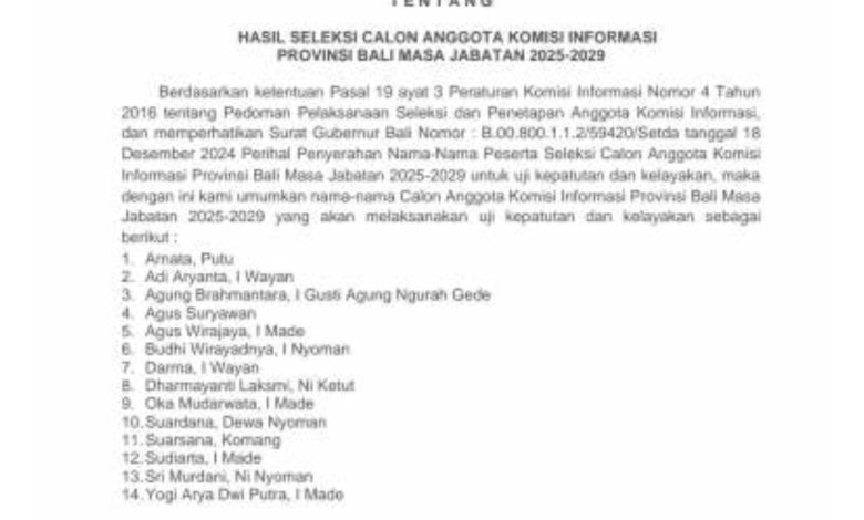 DENPASAR, jarrakposbali.com | Pengumuman Resmi hasil Seleksi Calon Anggota Komisi Informasi Provinsi Bali Masa Jabatan 2025-2029